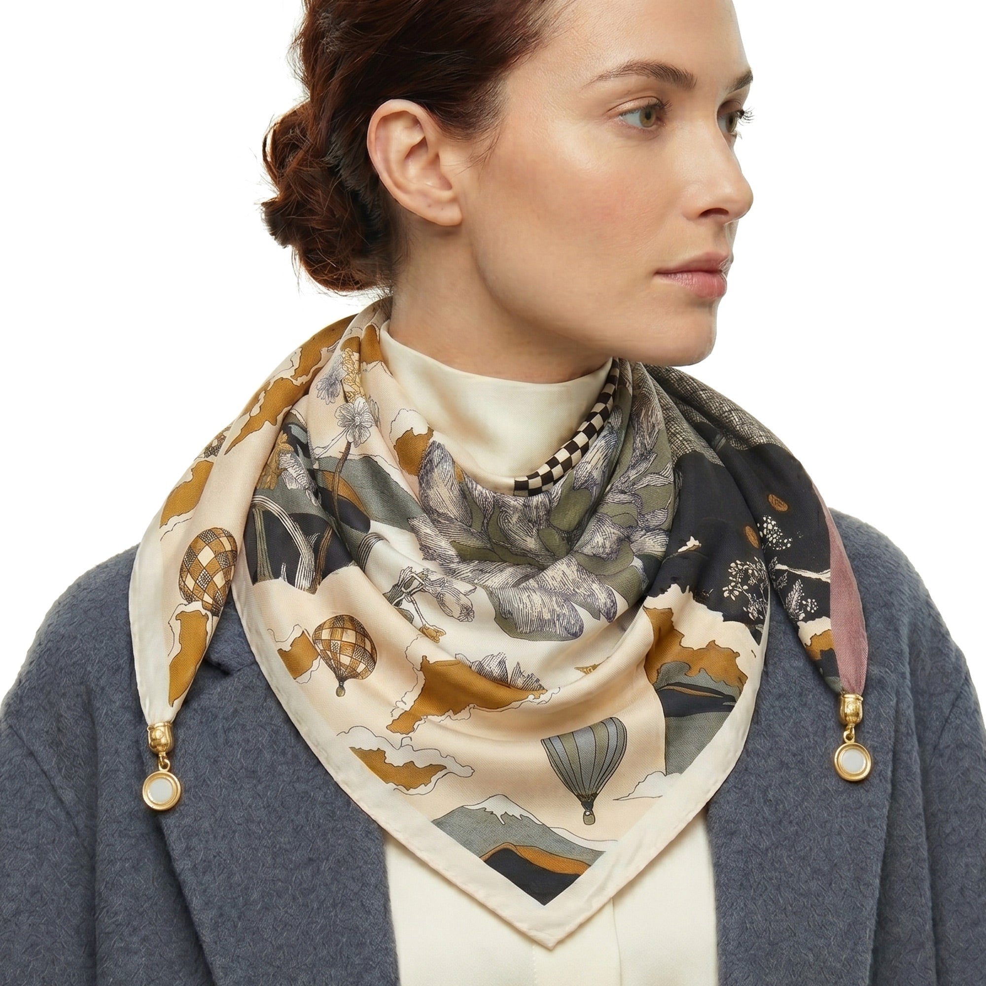 Damska, beżowa apaszka z zapięciem magnetycznym pozwala na ułożenie materiału bez ręcznego wiązania węzłów. Kwadratowy model LUNA wyposażono dodatkowo w złoty klips o charakterze biżuteryjnym, który trwale stabilizuje tkaninę. Format 68x68 cm ułatwia dopasowanie dodatku do dekoltu płaszcza lub marynarki w codziennych zestawieniach.