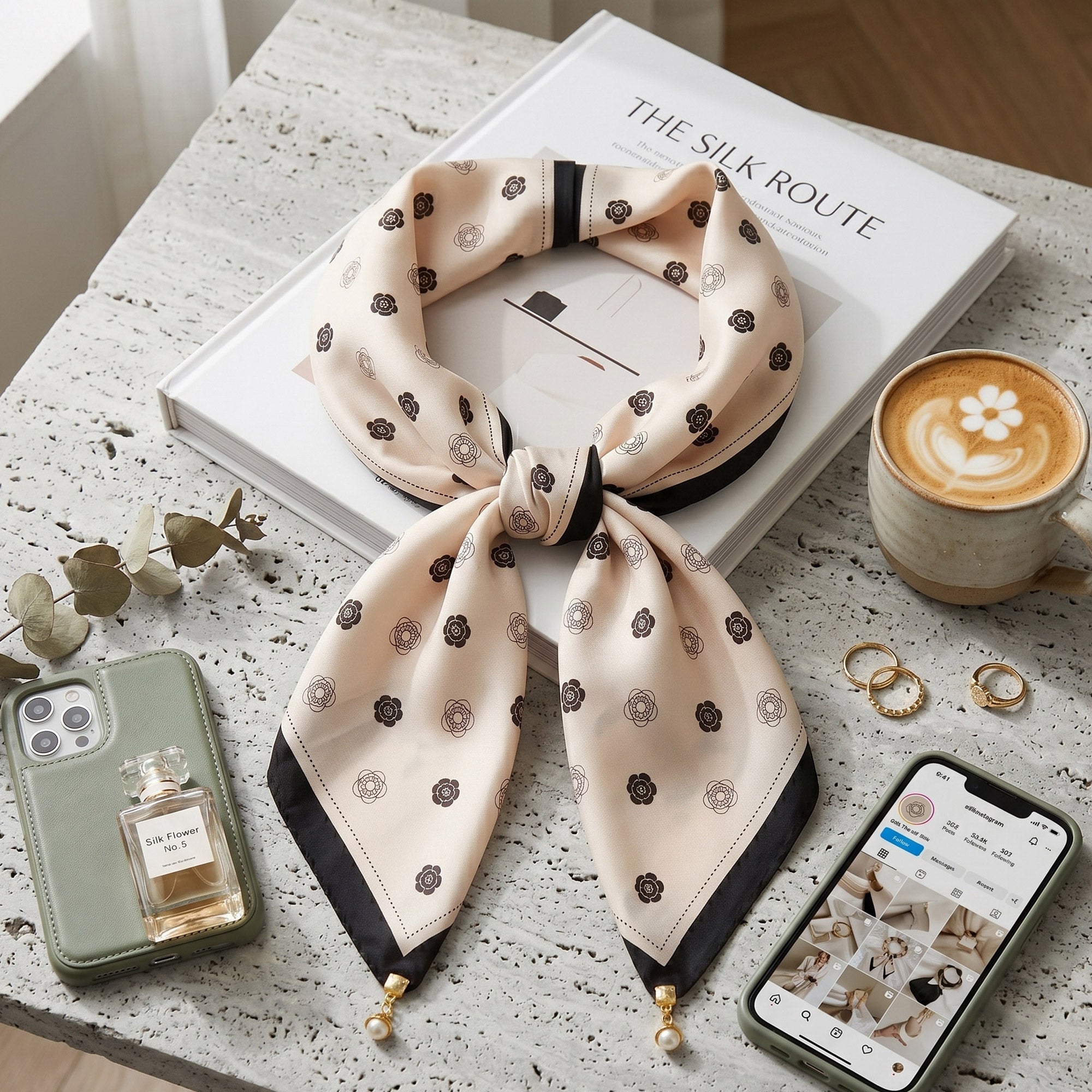 Casualowa, beżowa apaszka damska MIA wyróżnia się ozdobną, złotą zapinką, która całkowicie zastępuje tradycyjne węzły. Wbudowane zapięcie magnetyczne ułatwia codzienne zakładanie i pełni funkcję subtelnego detalu biżuteryjnego. Kwadratowy format o wymiarach 68x68 cm pozwala na swobodne ułożenie materiału pod kołnierzem płaszcza lub marynarki.