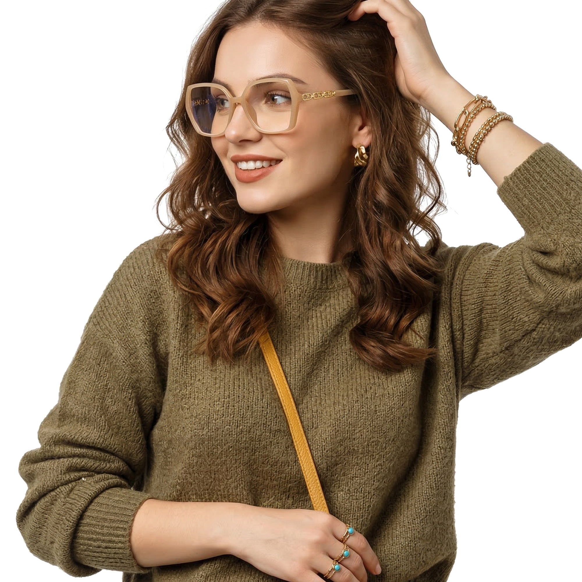 Damskie okulary AURIA to model o pełnych oprawkach w beżowym kolorze, wykonany z trwałego poliwęglanu. Te kwadratowe zerówki wyposażono w bezbarwne szkła z filtrem blue-light i powłoką antyrefleksyjną, co redukuje odblaski i chroni wzrok podczas pracy przed ekranem. Stałe noski stabilizują oprawę, a fabryczne soczewki można dostosować do indywidualnej wady wzroku poprzez wymianę na szkła korekcyjne.