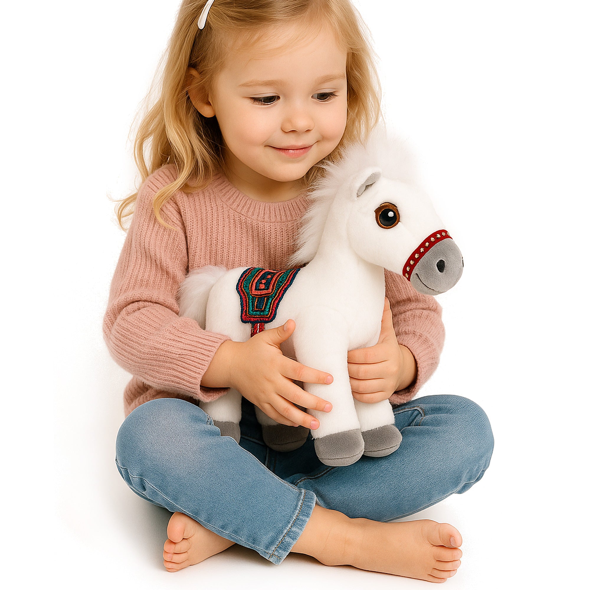 Przedstawiam uroczy pluszowy konik – idealny towarzysz zabaw dla każdego dziecka! Maskotka została wykonana z miękkiego, przyjemnego w dotyku pluszu, dzięki czemu jest doskonała do przytulania. Konik ma śliczną białą sierść, puszystą grzywę i ogon, a jego oczy są duże i błyszczące, co dodaje mu wyjątkowego uroku. Dodatkowo posiada kolorowe, haftowane siodło, które sprawia, że wygląda jak prawdziwy mały rumak. Wymiary maskotki: 35 × 30 cm Stabilne nóżki i staranne wykonanie pozwalają ustawić go w pozycji stojącej, co czyni go również świetną dekoracją dziecięcego pokoju. Najważniejsze cechy: - miękki, wysokiej jakości plusz - piękne detale: haftowane siodło, błyszczące oczy, ozdobna uzda - puszysta, biała grzywa i ogon - idealny do przytulania i zabawy - świetny pomysł na prezent dla małych miłośników zwierząt Ten uroczy konik z pewnością zdobędzie serce każdego dziecka! ?